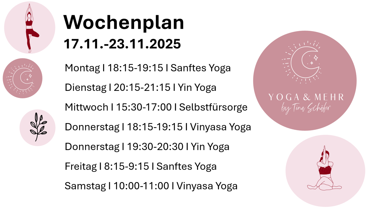 Ich biete verschiedene, regelmäßige Yogakurse an - von sanft und entspannend bis sportlich. Schau gerne auf den Kursplan und das Angebot und melde Dich bei mir, wenn Du Fragen hast. Alle Kurse finden in der TG Höchberg statt (Jahnstraße 2, 97204 Höchberg). Jeweils zum Beginn der Kursreihe (Januar/ April/ September) kannst Du die gesamte Kursreihe, bestehend aus 10 Stunden buchen. Außerdem kannst Du jederzeit einsteigen und mit der 5er oder 10er Karte flexibel teilnehmen und zwischen den Kursen wechseln...